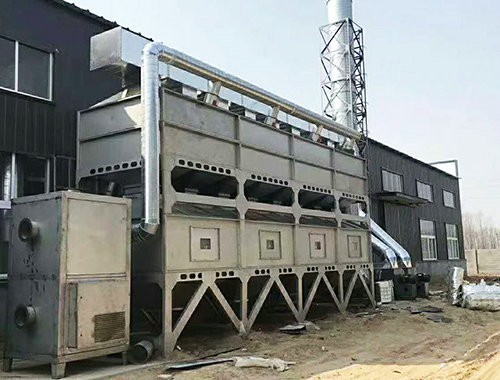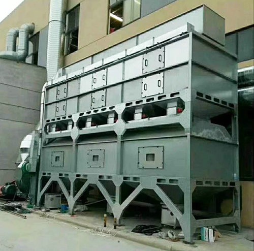 在化學反應過程中,利用催化劑降低燃燒溫度,加速有毒有害氣體完全氧化的方法,叫做催化燃燒法。由於催化劑的載體是由多孔材料製作的,具有較大的比表麵積和合適的孔徑,當加熱到300~450℃的有機氣體通過催化層時,氧和有機氣體被吸附在多孔材料表層的催化劑上,增加了氧和有機氣體接觸碰撞的機會,提高了活性,使有機氣體與氧產生劇烈的化學反應而生成CO2和H2O,同時產生熱量,從而使得有機氣體變成無毒無害氣體。